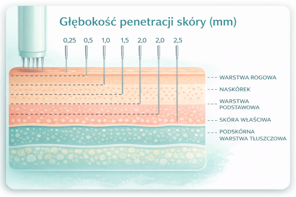 Ilustracja przedstawia różne głębokości penetracji skóry podczas mikronakłuwania – od 0,25 mm do 2,5 mm – oraz warstwy anatomiczne, do których dociera igła.